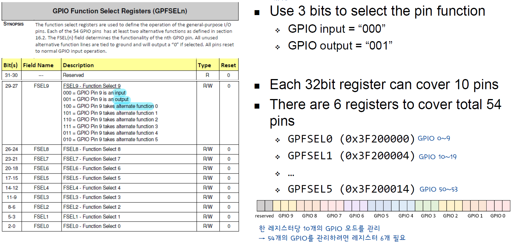 위 문서에서 GPFSELn 레지스터는 GPIO 핀의 모드를 설정하는 레지스터이다. 32비트 레지스터에서 3비트씩 하나의 GPIO 핀을 담당한다.