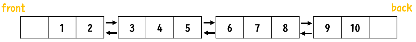 벡터는 연속된 공간에 메모리를 할당해 데이터를 순차적으로 저장하고, 공간이 부족하면 메모리를 재할당해 데이터를 복사한다. 이러한 재할당 오버헤드를 줄이기 위해 데크에서는 여러 개의 블록으로 쪼개어 저장한다. 따라서 포인터 연산을 통해 원소에 접근할 순 없지만, 인덱스를 통해 접근할 수는 있다.
