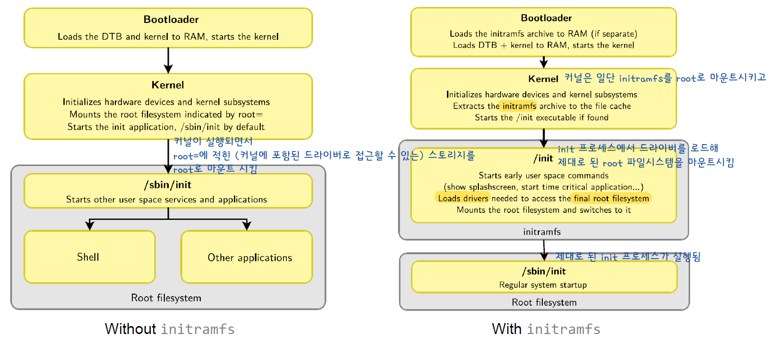 initramfs는 모든 파일, 라이브러리, 환경 설정, 도구 등을 cpio 아카이브에 모아놓은 이미지이다. 커널이 initramfs를 감지하면 tmpfs를 만들고 이 파일 시스템에 initramfs 내용을 추출한다. 그 후, tmpfs에 위치한 /init 프로세스를 실행시킨다. init 프로세스 내에서 실제 루트 파일시스템으로 전환하고, 실제 루트 파일 시스템의 /sbin/init을 호출해 부팅 과정을 진행한다.